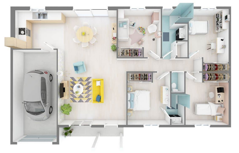 Maison moderne de plain-pied, de 60 à 120 m². Avec son design rectangulaire, elle propose 2 à 4 chambres, un séjour lumineux avec cuisine ouverte, et des baies vitrées donnant sur le jardin. Fonctionnelle et éco-responsable, elle est conçue selon les normes RE2020 et offre plusieurs options de personnalisation pour s’adapter à vos goûts et besoins. Idéale pour les jeunes familles ou primo-accédants recherchant confort et simplicité.